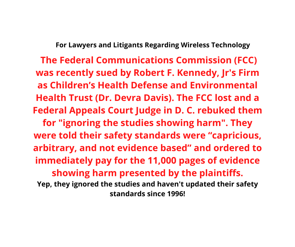 For Lawyers and Litigants Regarding Wireless Technology The Federal Communications Commission (FCC) was recently sued by Robert F. Kennedy, Jr’s Firm as Children’s Health Defense and Environmental Health Trust (Dr. Devra Davis). The FCC lost and a Federal Appeals Court Judge in D. C. rebuked them for “ignoring the studies showing harm”. They were … Continue reading FCC Sued by Robert F. Kennedy, Jr’s Firm and the Environmental Health Trust – Rebuked by Fed Appeals Court Judge in DC for Ignoring Studies on Harm from Wireless Tech & Ordered to Immediately Pay for 11,000 Pages of Evidence – Wanna See That Evidence?