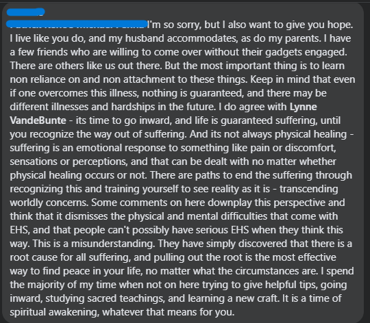 If you go to the sister site: TheTruthAboutTechnology.org you’ll see some pretty shocking insights about this reality. In the middle column I put a list of groups on facebook addressing WIRELESS INJURY. The conversation I’m posting here is intended to give you a glimpse into the life of someone who’s being adversely affected and the wisdom shared by those of us who’ve been suffering for YEARS now.