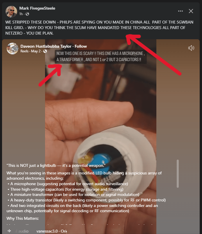 What you’re seeing in these images is a modified LED bulb hiding a suspicious array of advanced electronics, including: • A microphone (suggesting potential for covert audio surveillance) • Three high-voltage capacitors (for energy storage and filtering) • A miniature transformer (can be used for isolation or signal modulation) • A heavy-duty transistor (likely a switching component, possibly for RF or PWM control) • And two integrated circuits on the back (likely a power switching controller and an unknown chip, potentially for signal decoding or RF communication)