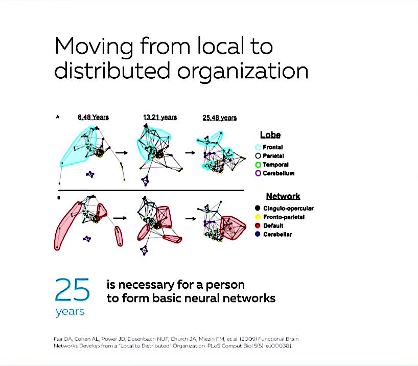 Connections in the brain are initially local and for us to concentrate and get our bearings in various situations takes 25 years.