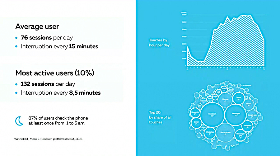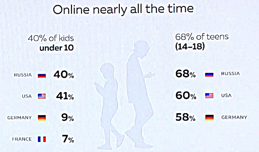 In the U.S. and Russia 40% of the children under 10 years of age are online nearly all of the time they’re awake to consume information and some of those leave their devices on while they sleep to respond to calls or messages.