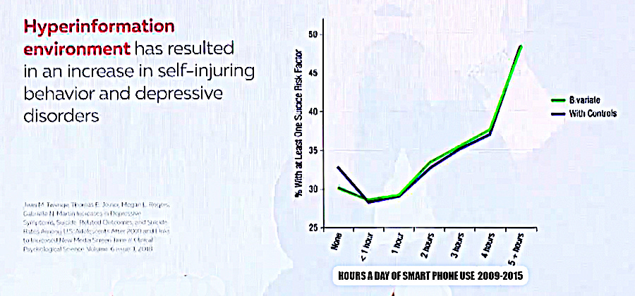 Research done in 2018, in which researchers used a large selection of individuals, showed that if smart phone users spent more than 2 1/2 or 3 hours using their phone the self injury behavior and depressive disorders increase dramatically.