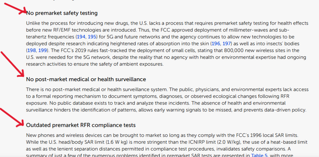 Unlike the process for introducing new drugs, the U.S. lacks a process that requires premarket safety testing for health effects before new RF/EMF technologies are introduced. Thus, the FCC approved deployment of millimeter-waves and sub-terahertz frequencies (194, 195) for 5G and future networks and the agency continues to allow new technologies to be deployed despite research indicating heightened rates of absorption into the skin (196, 197) as well as into insects’ bodies (198, 199). The FCC’s 2019 rules fast-tracked the deployment of small cells, stating that 800,000 new wireless sites in the U.S. were needed for the 5G network, despite the reality that no agency with health or environmental expertise had ongoing research activities to ensure the safety of ambient exposures.