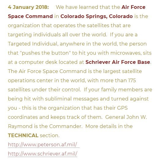 Targeted Justice first reported in January 2018, that the satellite weapons attacking civilians were controlled from Schriever Base near Colorado Springs.
